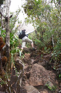 This pic should give some sense of the steepness o the "trail," and by trail, I mean "series of boulders arranged vertically,¨as well as a sense of the size of my pack, as well as a sense of my totally honkin' calf muscles.
